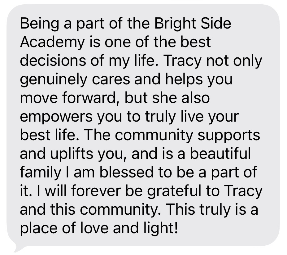 "Being in The Bright Side Academy and working with Tracy has been nothing short of amazing. I have grown so much and feel great physically, emotionally, and spiritually. Tracy has taught me so many tools to shift and work with energy on so many levels. I feel so empowered and deeply supported."